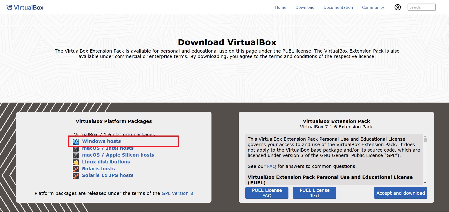 https://www.virtualbox.org/wiki/Downloads 에 접속해서 'Window host'를 다운받습니다.